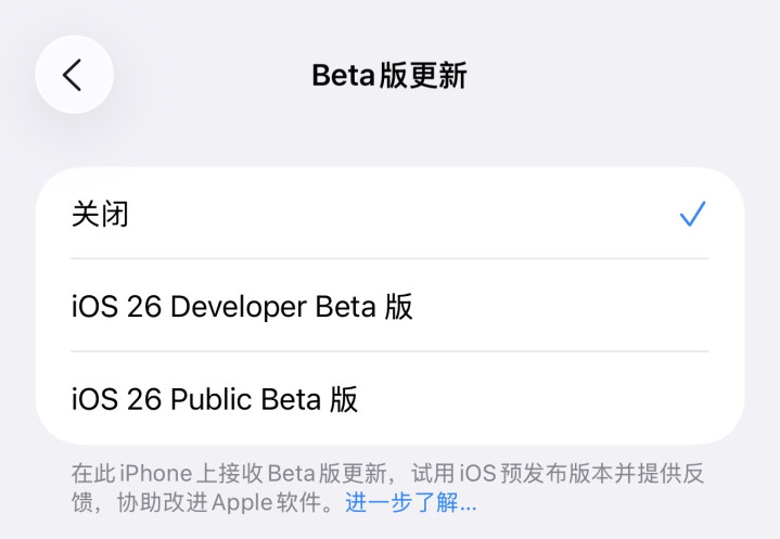顺便提醒,如果你目前正在使用 iOS 26 测试版本,但打算回到 iOS 26 正式版的话,那么在升级到 Beta 9 后,则可以前往 iPhone 设置 → 通用 → 软件更新 → Beta 版更新中将选项关闭。